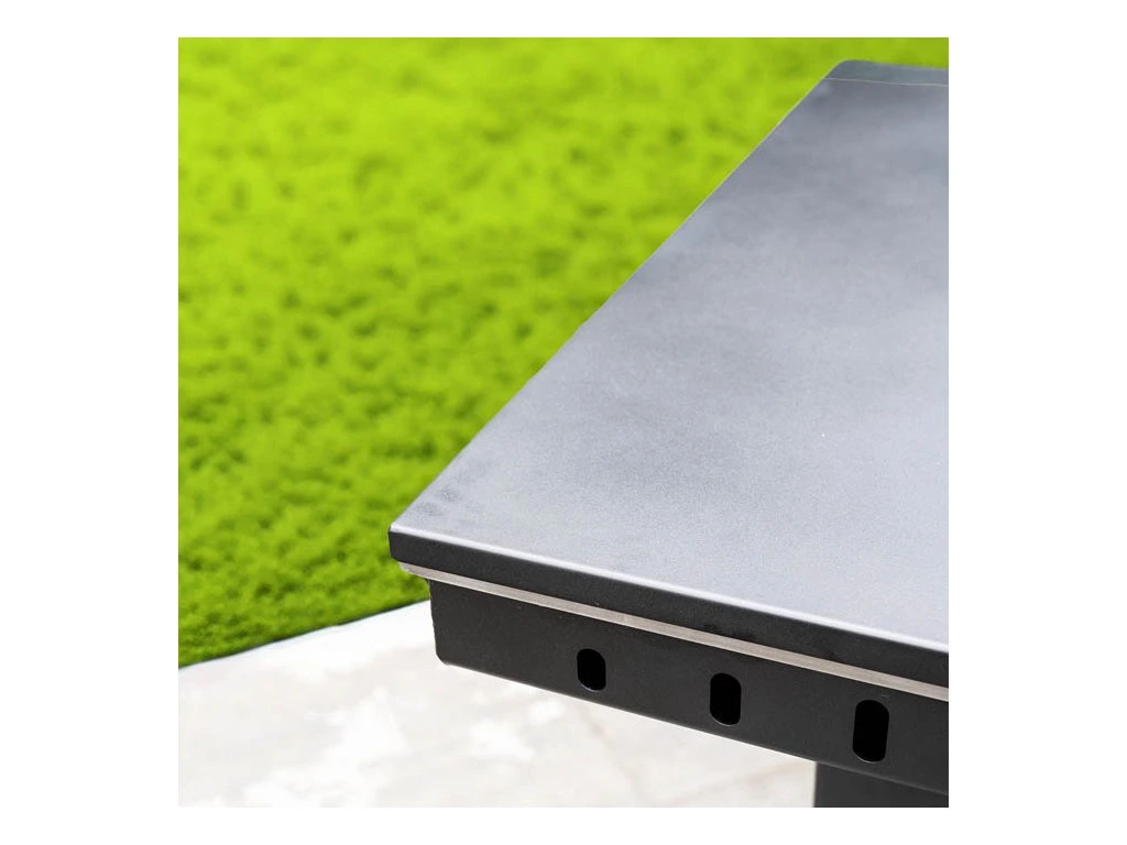 Stejně jako u většího modelu je kryt vyroben z odolného kovu a designově navazuje na minimalistický vzhled grilu. Díky tomu působí celý gril kompaktně a esteticky i mimo samotné grilování.